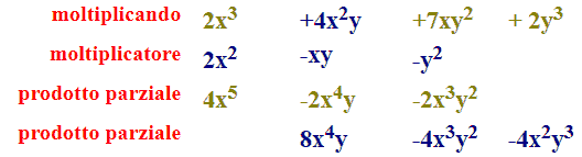 Ora scriviamo, nella riga successiva, il PRODOTTO, tra il SECONDO TERMINE del MOLTIPLICANDO e il MOLTIPLICATORE. In altre parole moltiplichiamo 4x2y per ogni termine del moltiplicatore.